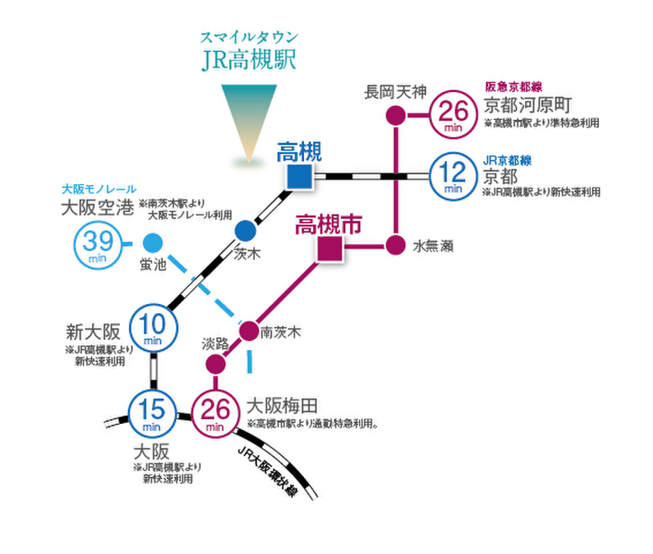 - JR東海道・山陽本線「高槻」駅 徒歩10分~11分阪急京都本線「高槻市」駅 徒歩19分~20分