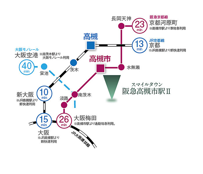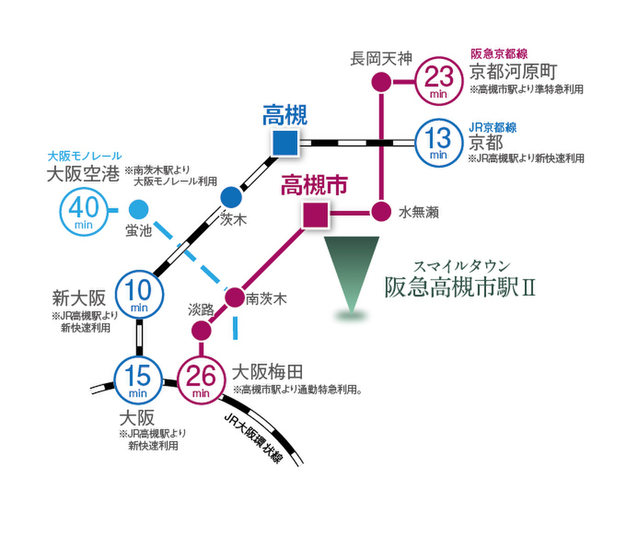 都心の喧騒から少し距離を置きながらも、大阪や京都の主要駅まで約30分と毎日の通勤・通学に便利。
