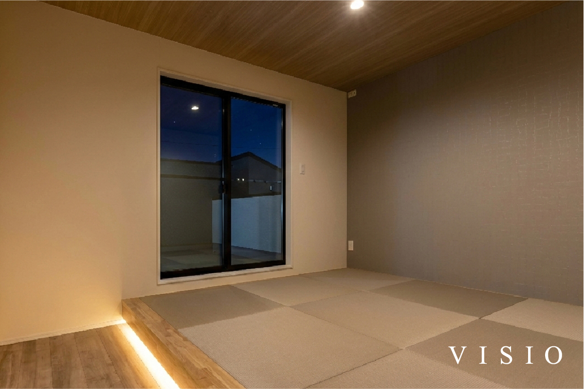 足触りのよい畳スペースに、段差部分の間接照明がやさしく灯る寝室...