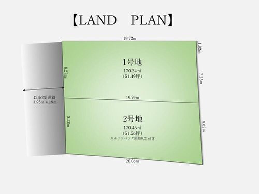 | 駐車場 | - | 道路の幅員 | 南西側約3.95~4.19mの公道、2号地セットバック要(約0.21m2) |