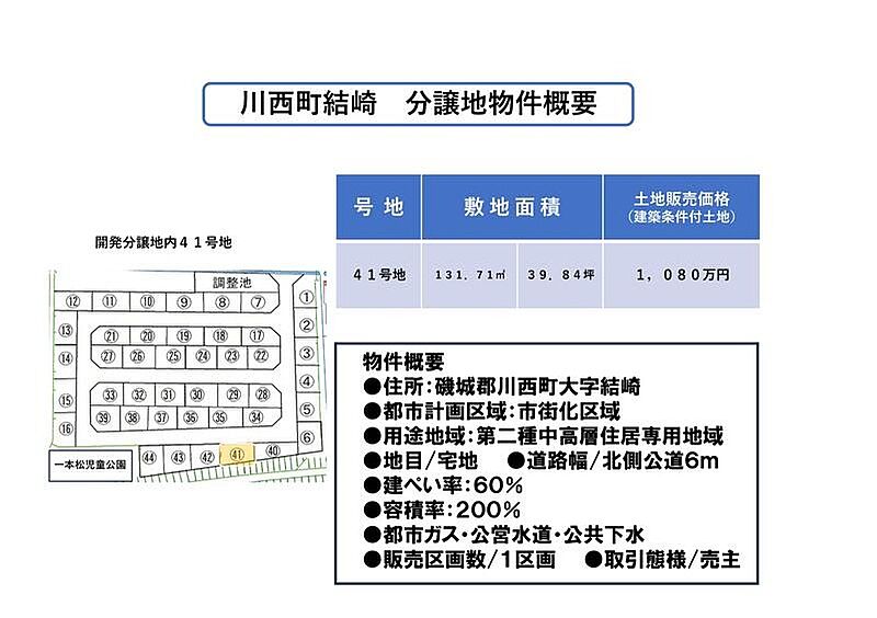 | 建築条件 | 建築条件付 建築条件付き土地とは一定期間内に、その土地に建築する建物の請負契約が締結されることを条件に販売される土地のことです。 土地売買契約締結後、建築請負会社と購入した土地に建築する建物について協議することになります。広告に参考プランが掲載されている場合でも、プランは一例であり、実際の建築プランは建築請負会社と土地購入者で協議・検討することが可能です。 期間内に建築プランが決まらず建築請負契約が成立しなければ土地売買契約は白紙となり、支払済みの金銭はすべて返還されます。 建築請負会社が指定されている場合と指定されていない場合があります。 また、建築条件付き土地の価格には、建物価格は含まれません。 |