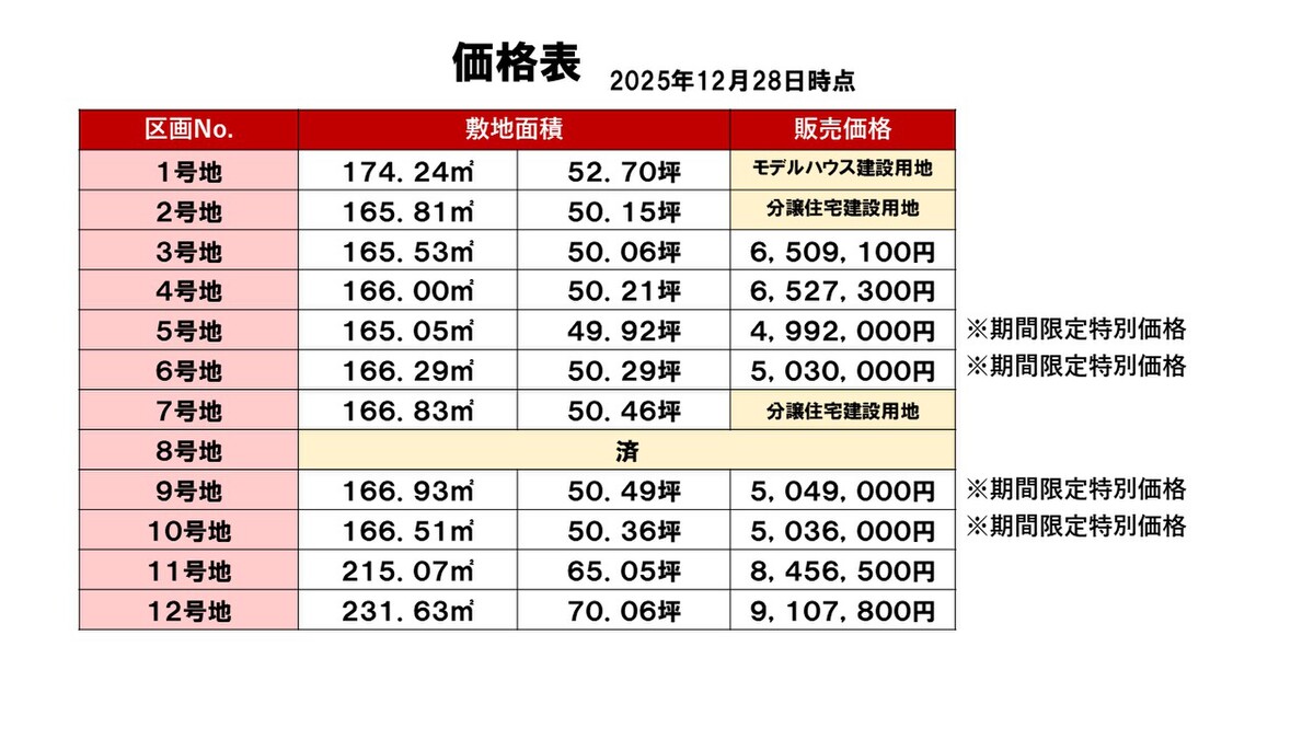 | 販売区画数 / 総区画数 | 8区画 / 12区画 | ||
