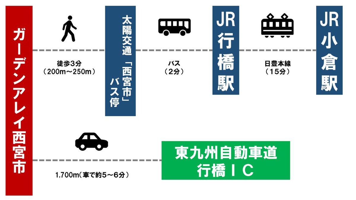 JR日豊本線「行橋」駅 徒歩14分~15分 太陽交通バス 「西宮市」停 徒歩4分~5分 |