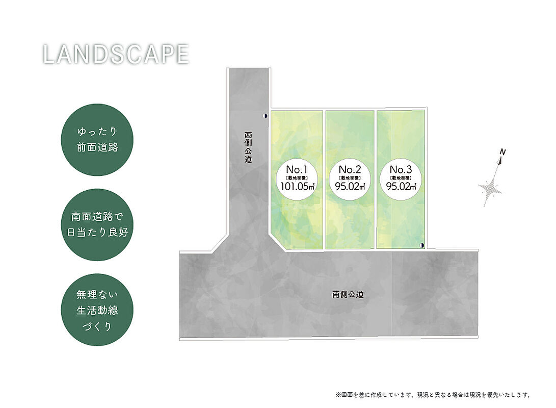 | 建築条件 | 建築条件付 建築条件付き土地とは一定期間内に、その土地に建築する建物の請負契約が締結されることを条件に販売される土地のことです。 土地売買契約締結後、建築請負会社と購入した土地に建築する建物について協議することになります。広告に参考プランが掲載されている場合でも、プランは一例であり、実際の建築プランは建築請負会社と土地購入者で協議・検討することが可能です。 期間内に建築プランが決まらず建築請負契約が成立しなければ土地売買契約は白紙となり、支払済みの金銭はすべて返還されます。 建築請負会社が指定されている場合と指定されていない場合があります。 また、建築条件付き土地の価格には、建物価格は含まれません。 |