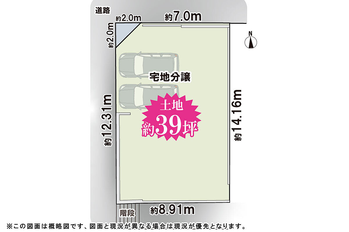 | 駐車場 | 0台 ~ 2台 | 道路の幅員 | 北側(公道)幅員4.5m間口9.28m、西側(公道)幅員5.4m間口14.20m |