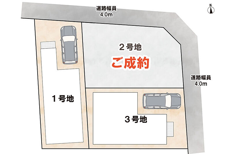 | 駐車場 | 1台 | 道路の幅員 | 1号地:北側公道 幅員約4.0m、3号地:東側公道 幅員約4.0m |
