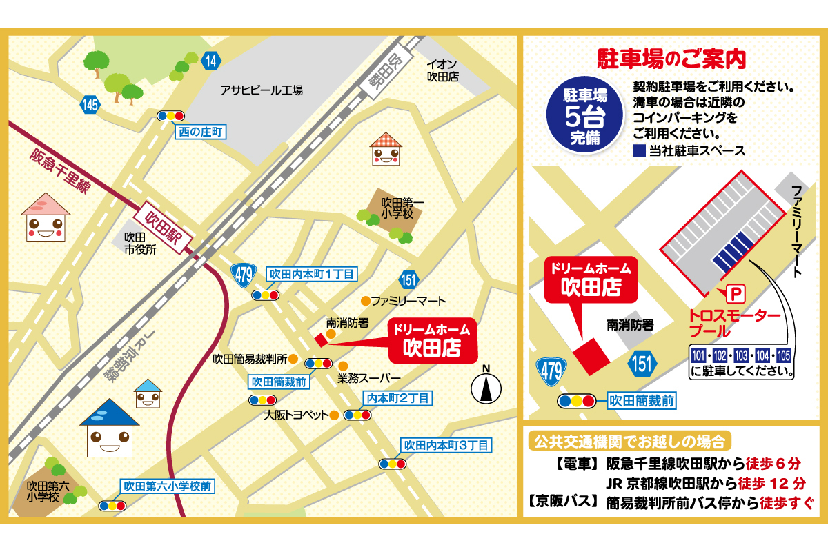 現地見学会(事前に必ずお問い合わせください) 日程/毎週土日祝 時間/10:00~18:00 ◆プライベート見学会ご予約受付中◆ モデルハウス内は換気・消毒を実施しながら「一組様ずつご案内」いたします。 ご希望日時をお電話またはメールにてお知らせください。 ●お車でいらっしゃる場合 →お店の北側パーキングに駐車してください。(お支払いは弊社で行います。) ●電車でいらっしゃる場合 →阪急千里線「吹田駅」から徒歩6分、JR京都線「吹田駅」から徒歩12分で到着します。 ●キッズルーム完備! 小さなお子様も退屈しないよう、おもちゃをご用意しております。 ●見学の際はお客様のご希望に合わせて3コース設けております! 1)サクッと現地見学コース(所要時間:約30分) お忙しいお客様向けです。 物件のご案内(主に間取り)のみさせていただきます。 2)じっくり見学コース(所要時間:約1時間) 物件の雰囲気だけではなく、設備などもしっかり確認されたいお客様向けです。 間取りに加え、気になる設備などもしっかりご案内いたします。 3)納得見学コース(所要時間:約2時間) 物件の間取り、設備に加え、周辺環境もご案内いたします。 現時点は、小学校、スーパー、図書館などご家族でご利用されることは予想される施設を車で回る予定です。 ●ローン相談など、上記以外のご希望も承りますので、お気軽にご連絡くださいませ。 |