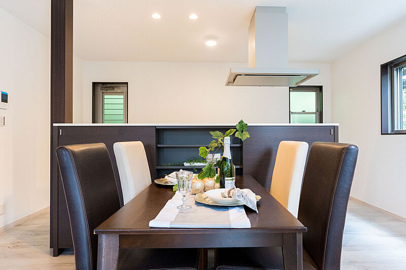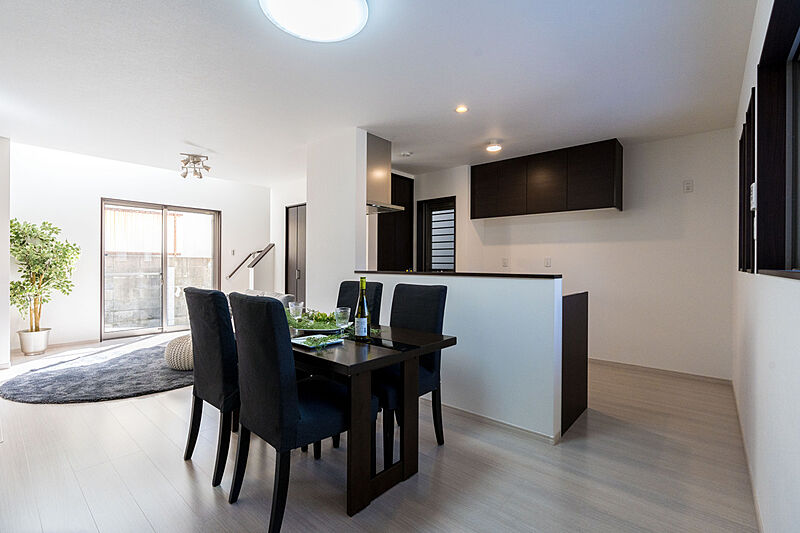 ■正面に遮るものがない対面キッチンで、リビングルームにいるご家...