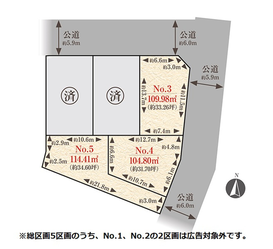 | 建物面積 | - | 土地面積 | 109.98m2(No.3)、104.80m2(No.4)、114.41m2(No.5) |