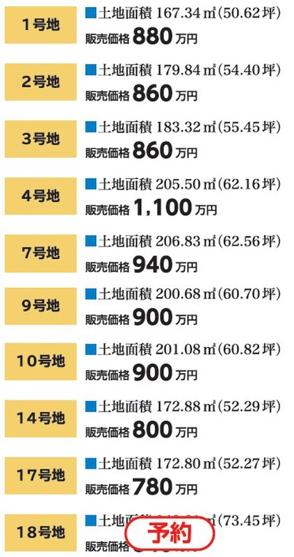 | 販売価格 | 780万円~1,100万円 | 最多価格帯 | 800万円台(5区画) |