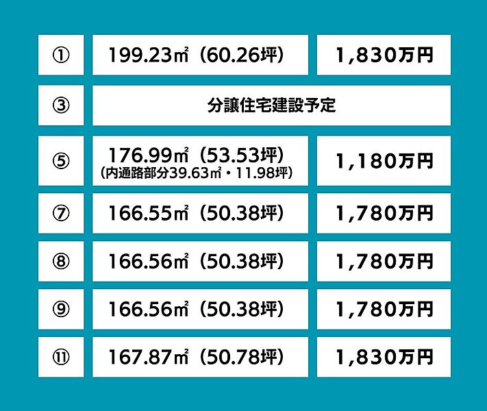 | 販売価格 | 1,180万円~1,830万円 | 最多価格帯 | 1700万円台(3区画) |
