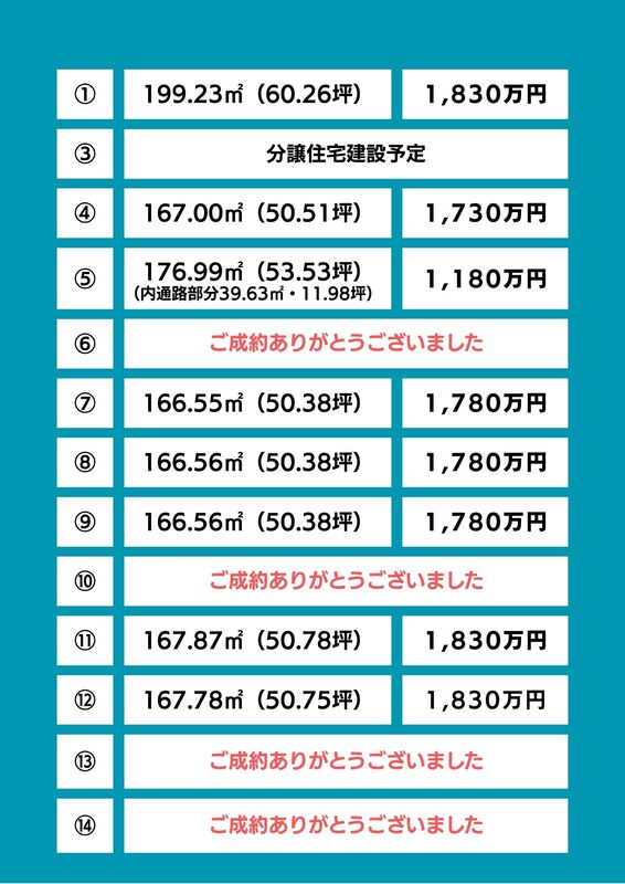 | 販売価格 | 1,180万円~1,830万円 | 最多価格帯 | 1700万円台(5区画) 1800万円台(4区画) |
