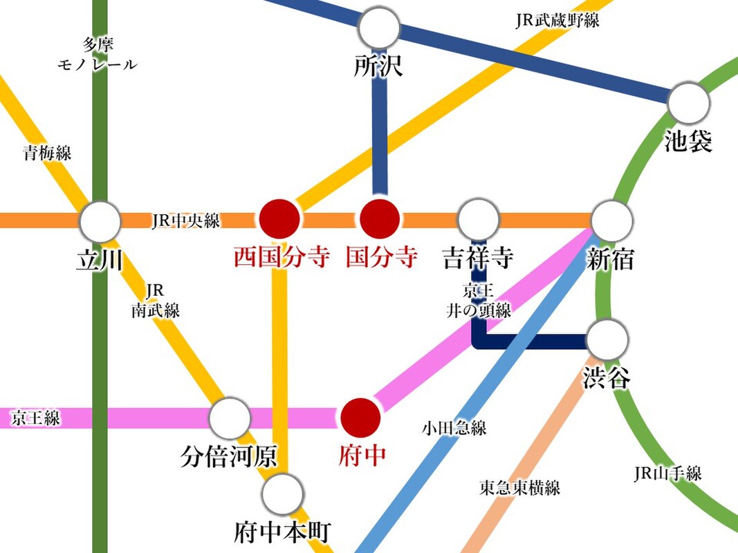 - JR中央線「国分寺」駅 徒歩19分京王線「府中」駅 バス乗車9分「栄町一丁目」 徒歩5分JR武蔵野線「西国分寺」駅 徒歩31分