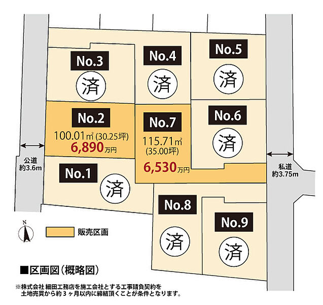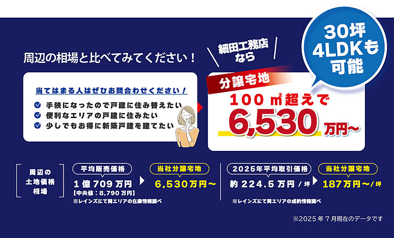 【先着順申込受付】 ■受付時間:午前9時~午後6時(火・水定休日) ■受付場所:細田工務店 注文営業部 0120-539-771 ※お申込みの際は認印、身分証明書(運転免許証、健康保険証、マイナンバーカードなど)、 直近2年分の収入証明書(源泉徴収票・確定申告書の写し等)をご持参ください。 ※先着順受付のため、お申込み済み、ご契約済みの場合があります。予めご了承願います。 ※この土地は土地売買契約後3ヶ月以内に細田工務店と住宅建築請負契約を結んでいただくことを停止条件として販売します。土地売買契約後、ただちに建築設計の協議をしていただきますが、3ヶ月以内に住宅の建築請負契約が成立しなかった場合は、土地売買契約は白紙となり、申込金その他お預かりした金銭は全額無条件で返還します。 |