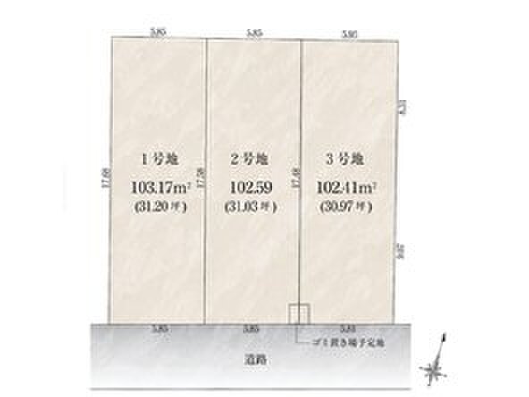 魅力1 建築条件付き売地(全3区画)約30坪!南道路で陽当たり良好