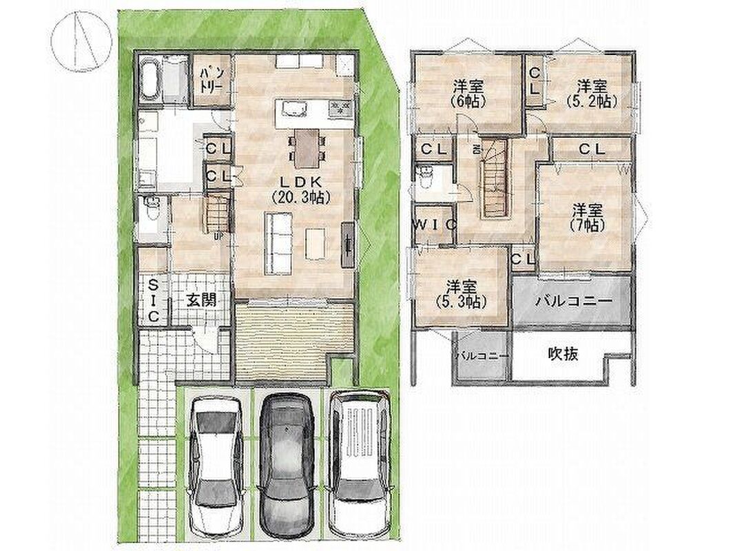 <プラン例(4LDKの間取り)>※間取り変更可能です・みんなが集うLDKは20.3帖!・お車3台分のカースペース完備!・1階にはアウトドアを楽しめる空間のウッドデッキあり・ウォークイン