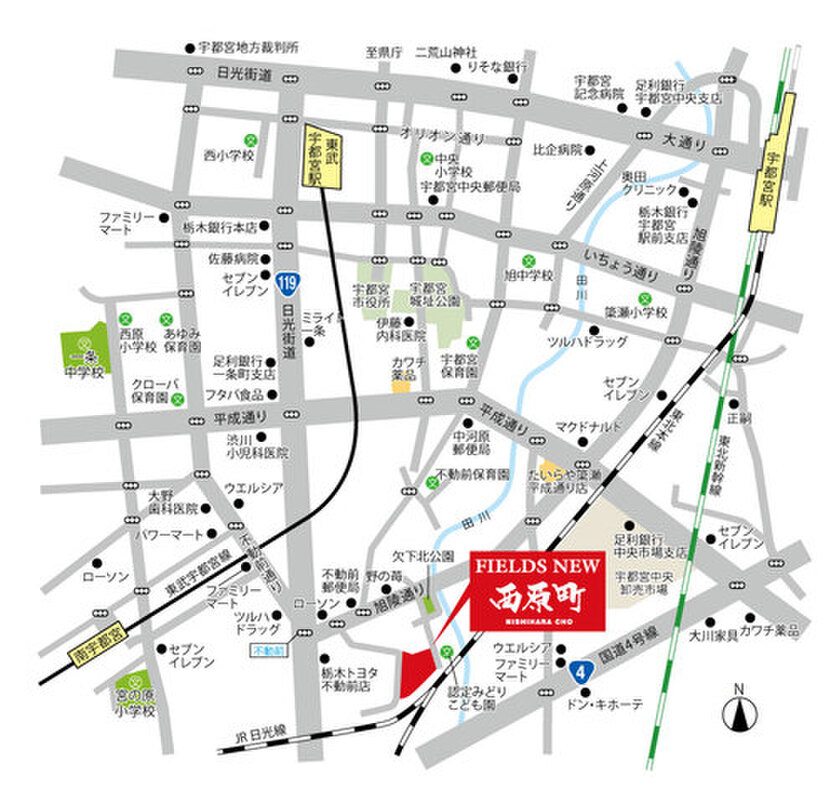 東武宇都宮線「東武宇都宮」駅 徒歩28分~30分 JR東北本線「宇都宮」駅 徒歩29分~32分 |
