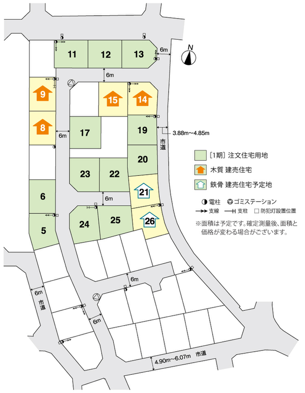 【主たる設備の概要】 ガス:都市ガス、雨水:道路内浸透及び宅内浸透槽、雨水桝:有、宅地内雨水浸透槽区画:有 【宇都宮市立地適正化計画について】 本物件は、宇都宮市立地適正化計画における居住誘導地域及び都市機能誘導区域に該当していません。 【景観条例について】 宇都宮市全域が景観法に基づく景観条例・景観計画が施行されており、一定規模を超える建築行為等を行おうとする時は、行為の着手の30日前までに届出が必要です。 (建築物) 高さ10m、又は延建築面積が1,000m2を越えるもの。 (工作物) さく、塀、垣はが5mをこえるもの。 【防災ハザードマップについて】 「宇都宮市防災ハザードマップ:洪水・土砂災害ハザードマップ(2024年6月発行)」の浸水想定区域に該当していません。 【水道加入金】 20mmの場合 113,000円(税別)検査手数料他別途 4,800円 【建築条件付分譲地】 この土地は、土地売買契約締結後3ケ月以内にトヨタウッドユーホーム株式会社と住宅の建築請負契約を締結することを条件として販売します。この期間内に住宅建築請負契約が成立しない場合は、土地売買契約は白紙となり、お預りした金銭は全額速やかにお返しします。 【分譲土地】 No.5 169.14m2(51.16坪) No.6 169.00m2(51.12坪) No.11 175.54m2(53.10坪) No.12 176.31m2(53.33坪) No.13 173.81m2(52.57坪) No.17 186.55m2(56.43坪) No.19 164.80m2(49.85坪) No.20 168.18m2(50.87坪) No.22 184.21m2(55.72坪) No.23 184.30m2(55.75坪) No.24 188.13m2(56.90坪) No.25 186.87m2(56.52坪) |