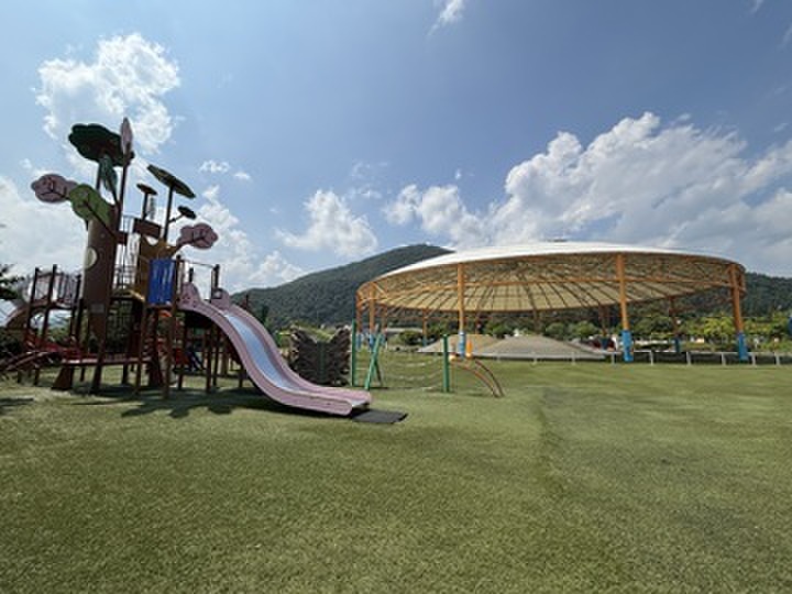施設内には、青々とした芝生や様々なアスレチック遊具と噴水があり...
