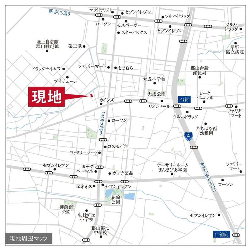 - ※地図、航空写真情報および地形ならびに周辺のお店・施設は、必ずしも現況を表すものではありません。